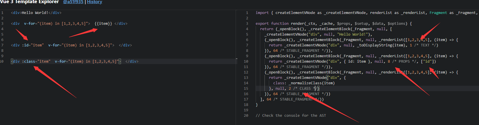 export function render(_ctx,_cache,$props,$setup,$data,$options){return (_openBlock(),_createBlock(_Fragment,null,[ _createvNode( "span", null,"Hello world ! "), _createvNode( "span",null,"Hello world! "), _createvNode( "span",null,"Hello world! "), _createvNode( "span", null,"Hello world! "), _createVNode("span", null,_toDisplaystring(_ctx.msg),1/* TEXT */), _createvNode( "span", null,"Hello world! "), _createvNode( "span", null,"Hello world! ")],64/*STABLE_FRAGMENT */)) - 新增了 patch flag 标记ts