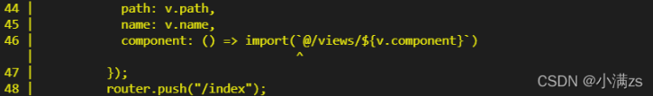 tsconst initRouter = async () => { const result = await axios.get('http://localhost:9999/login', { params: formInline }); result.data.route.forEach((v: any) => { router.addRoute({ path: v.path, name: v.name, //这儿不能使用@ component: () => import(`../views/${v.component}`) }) router.push('/index') }) console.log(router.getRoutes()); }后端代码 nodejs express